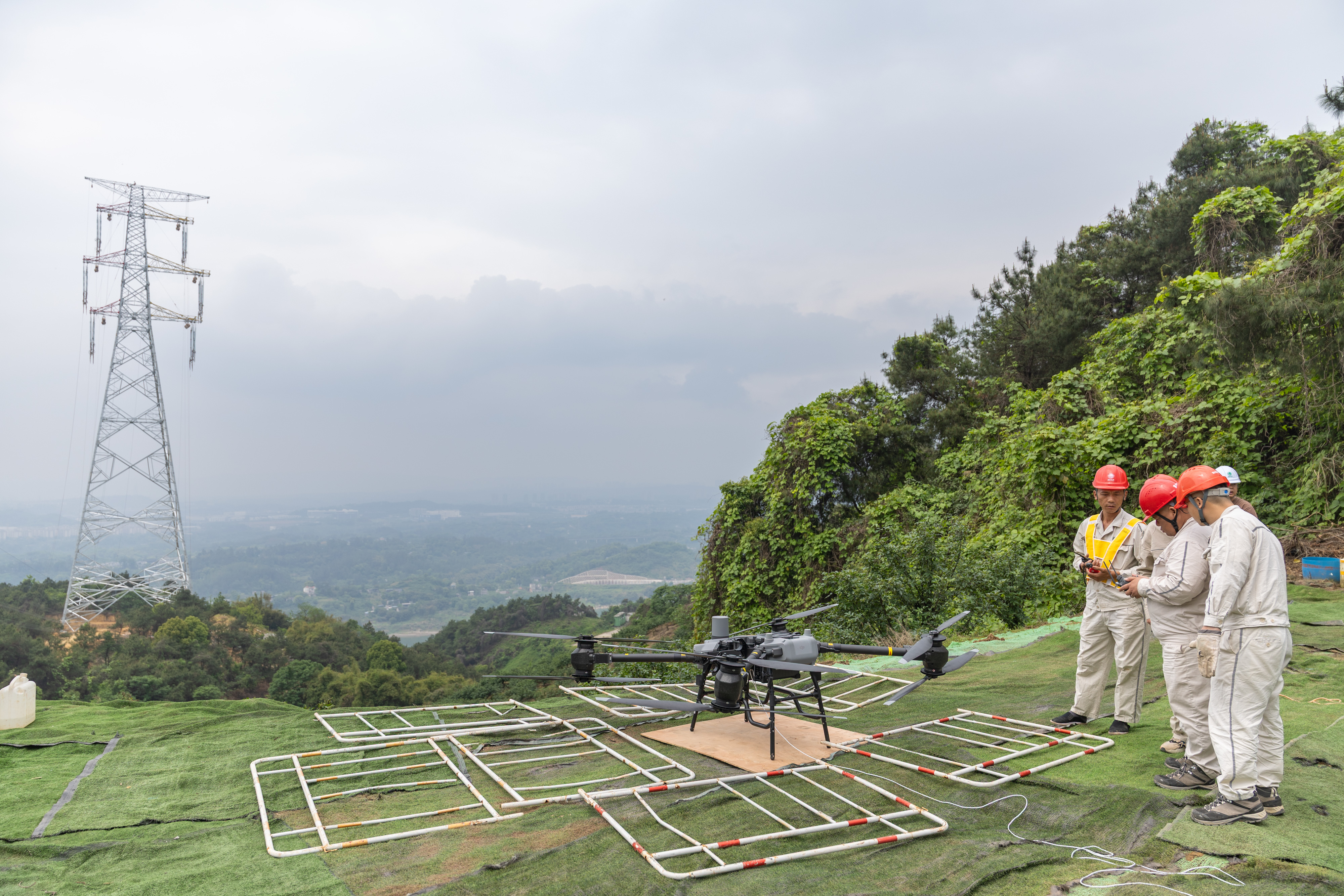4月11日下午,在位于重庆市江津区珞璜镇的新玉500千伏输变电工程(线路部分)跨长江放线作业现场,国网重庆电力的工作人员使用大载重无人机搭载四段投掷器,牵拉导引绳顺利跨越长江。
